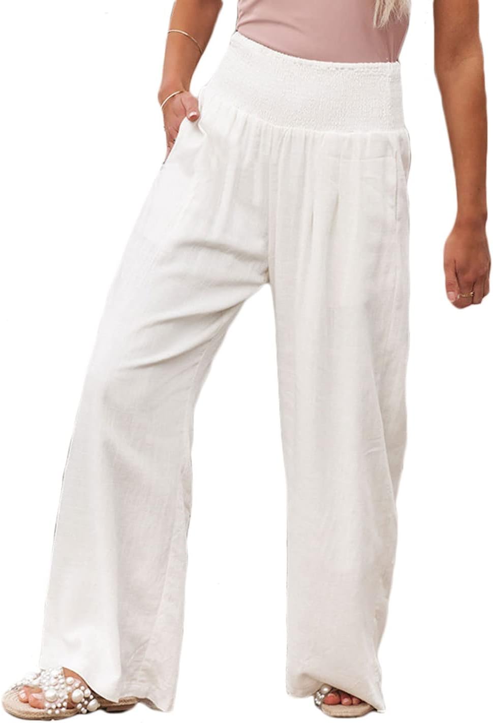 loveimgs Women's Boho Cotton Linen Wide Leg Lounge Pants Elastic Waist Beach Palazzo with Pocket
