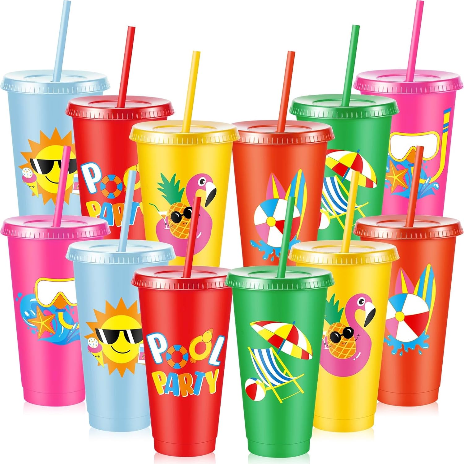 Chuangdi 12 Pcs Beach Pool Party Plastic Cups with Lids and Straws 24 oz Summer Luau Swimming Pool Themed Tumblers Drinking Cups for Beach Ball Hawaii Holiday Gifts Birthday Party Decorations Favors