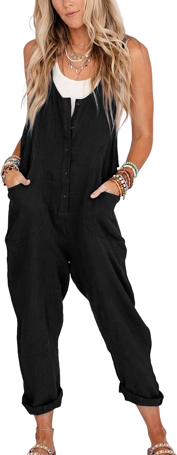 Yeokou Womens Overalls Linen Cotton Jumpsuits Loose Casual Jumpers with Pockets