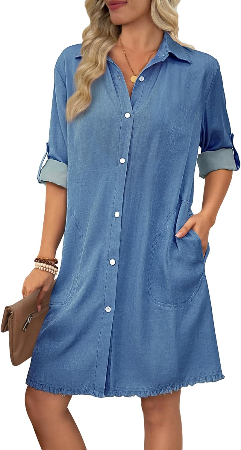 Bsubseach Women Denim Shirt Dress Long Sleeve Button Down Casual Shirt Dresses with Pockets