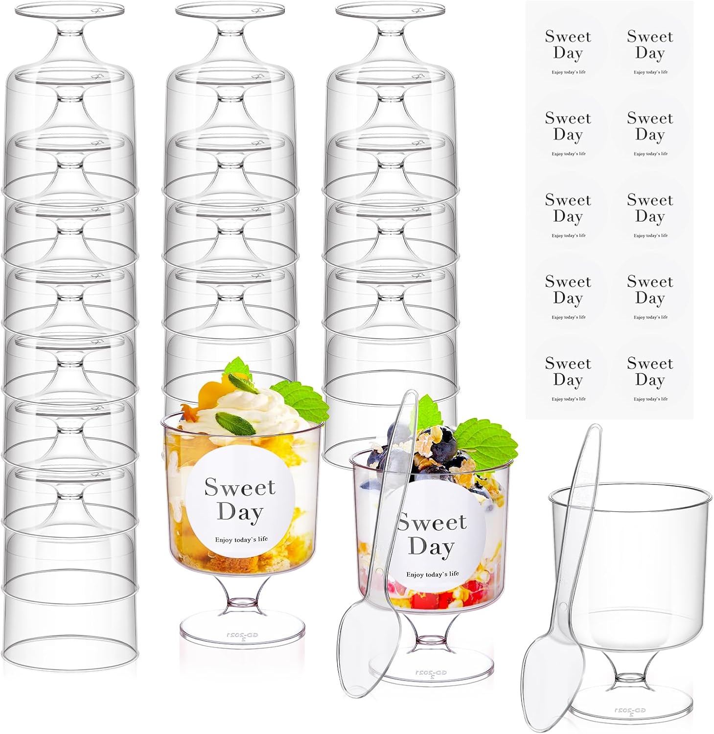 - Value Set: This set includes 50 5 OZ clear dessert cups, 50 dessert spoons and 50 small stickers, enough to meet the needs of any occasion. Whether it's a party, an event or a dessert cafe, these dessert cups and spoons are ideal