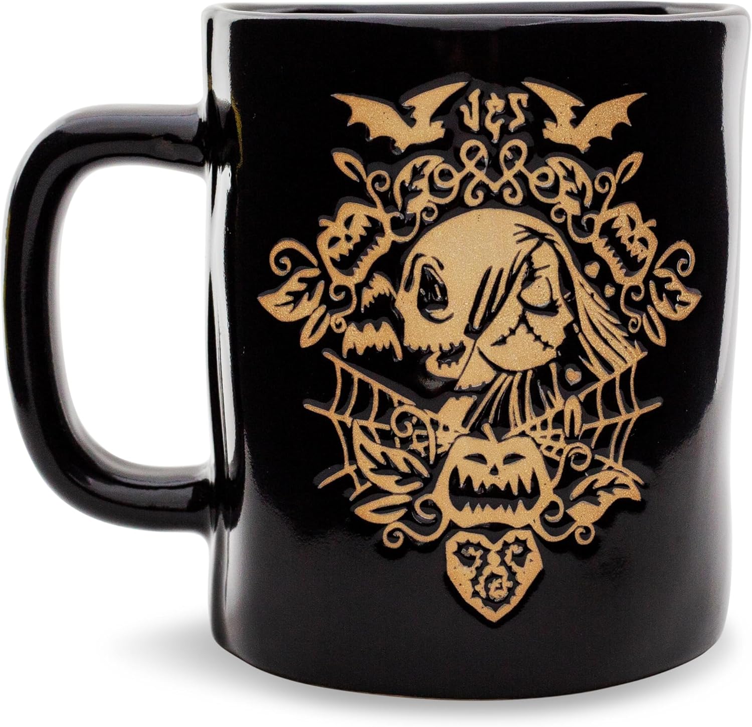 - SPOOKTASTIC STYLING: Jack and Sally star in an intricate design on this spookular mug finished in black with cream detailing. The two sweethearts bring the screams to any cup of your favorite beverage, along with bats, pumpkins, and more.