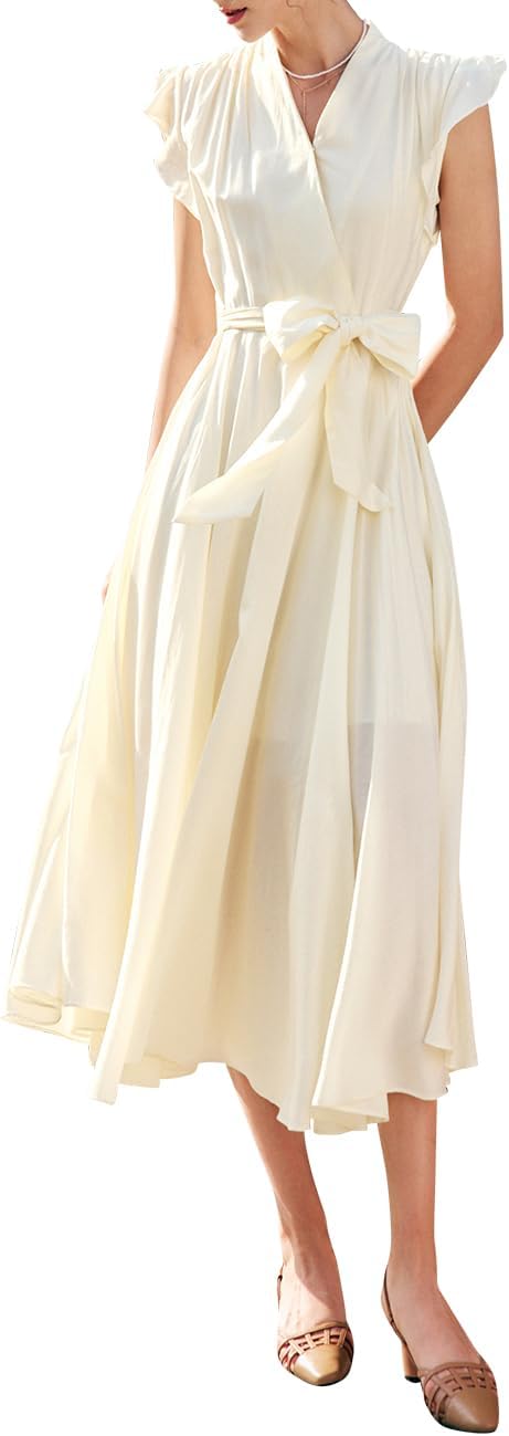 Women's Flowing Long Dress, V-Neck Waist Tie A-line Summer Casual Midi Dress
