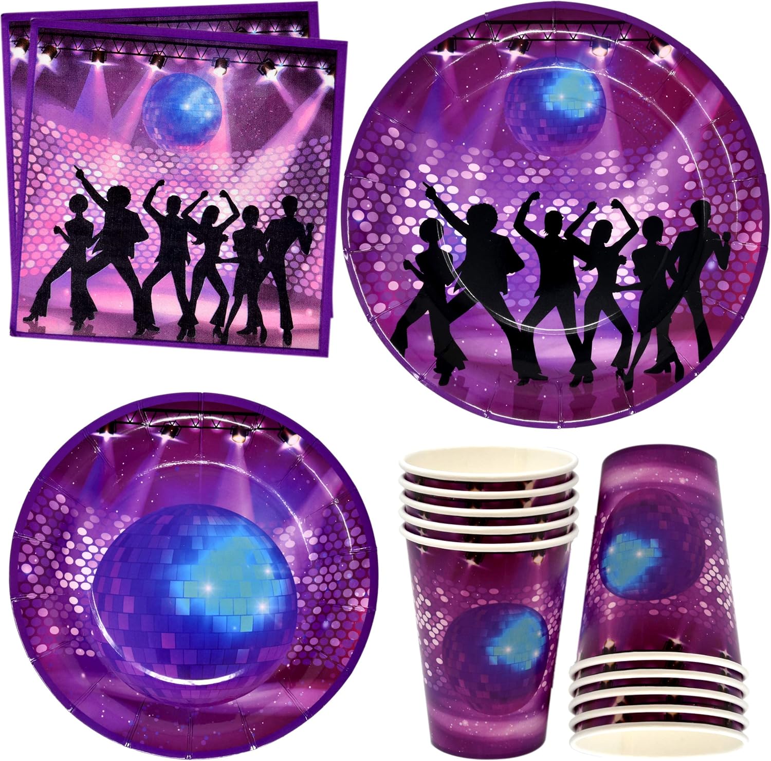 - Disco Party Set Serves 24: Gift Boutique disco dance party set includes 24 9” Dinner Plates featuring a disco ball with shining lights onto dancers with a purple background and 50 Luncheon Napkins coordinating. 24 7” Dessert Plates is designed with a glowing blue and purple disco ball and 24 9 oz. cups has a black background with orange flames on bottom.
