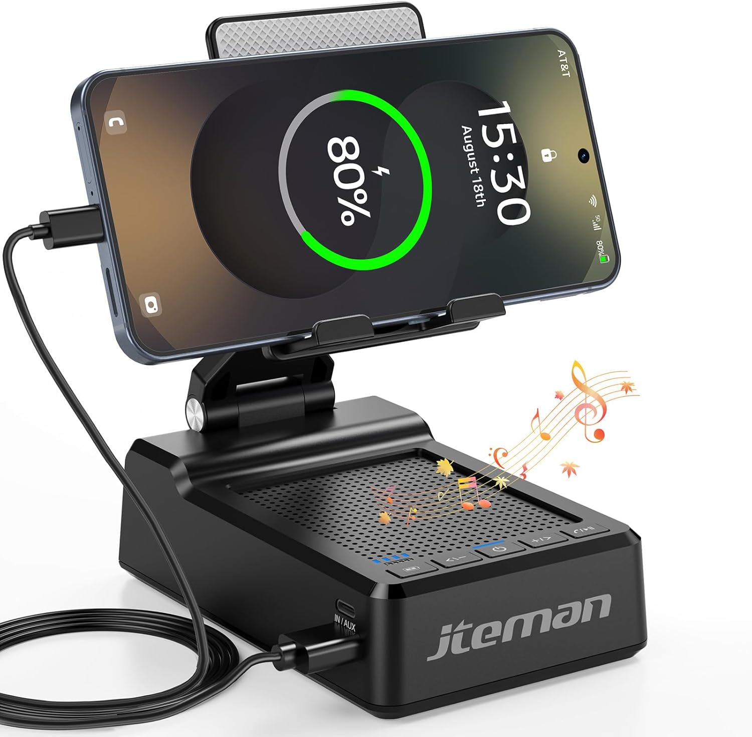 - 3-in-1 Design Creative Gift: Jteman Wireless Bluetooth Speaker and Charging Function Stand is a very practical and multi-functional unique gift, perfect for women and men! The device combines a Bluetooth speaker, cell phone stand, charging function, and built-in microphone. It also brings great convenience for watching videos and making hands-free calls. Enjoy powerful stereo sound, deep bass, and distortion-free, crystal-clear audio with our portable Bluetooth speakers.