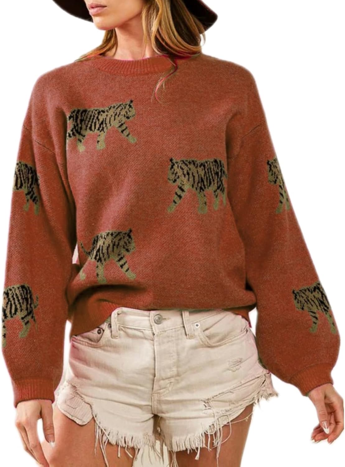 Women Y2k Sweaters Vintage Tiger Print Long Sleeve Pullover Sweater Fall Knitwear Streetwear