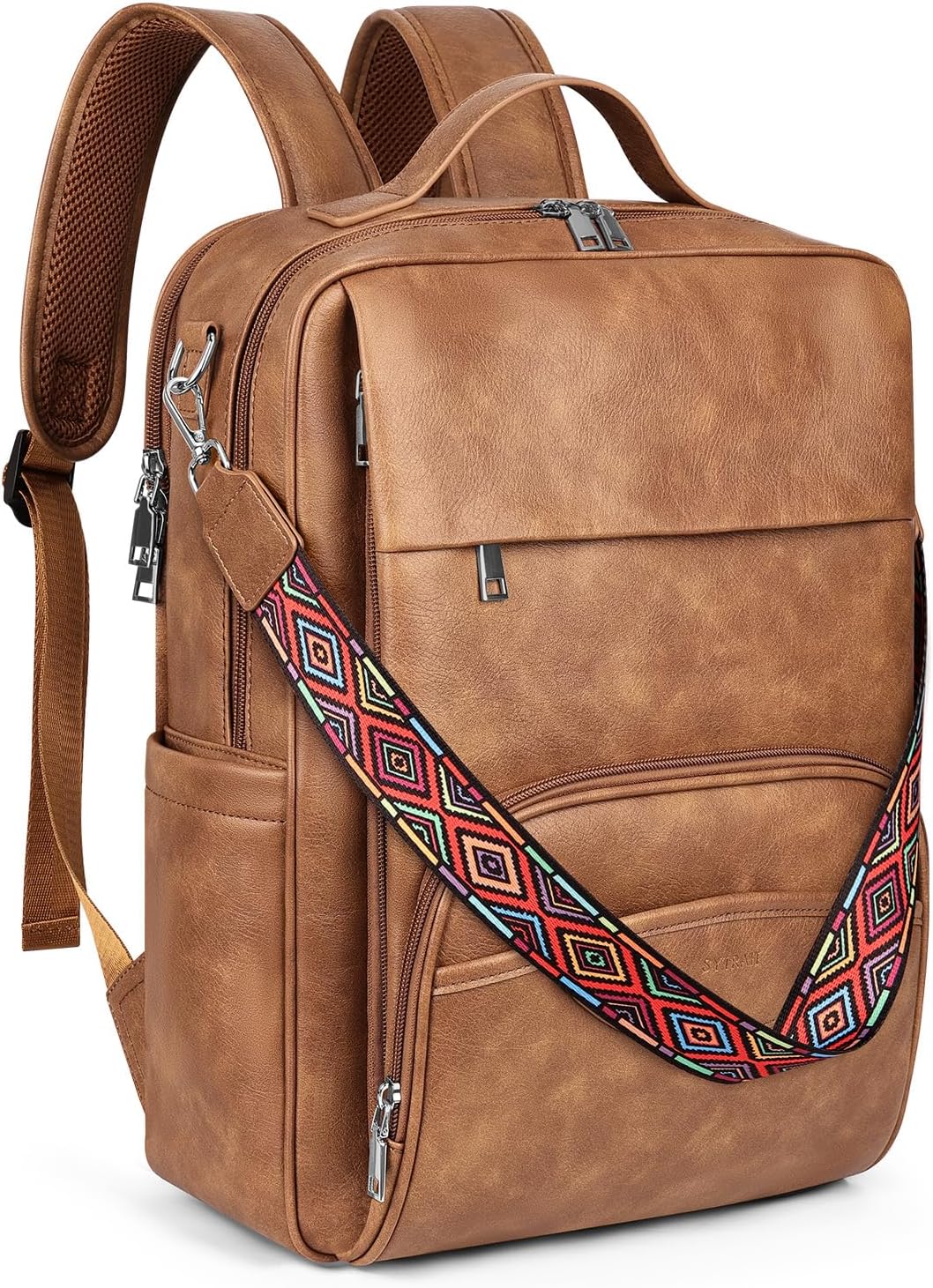 Leather Laptop Backpack for Women, 15.6 Inch Business Computer Bag, Designer College Backpack Travel Backpack with Colorful Shoulder Bag Strap Mocha Brown