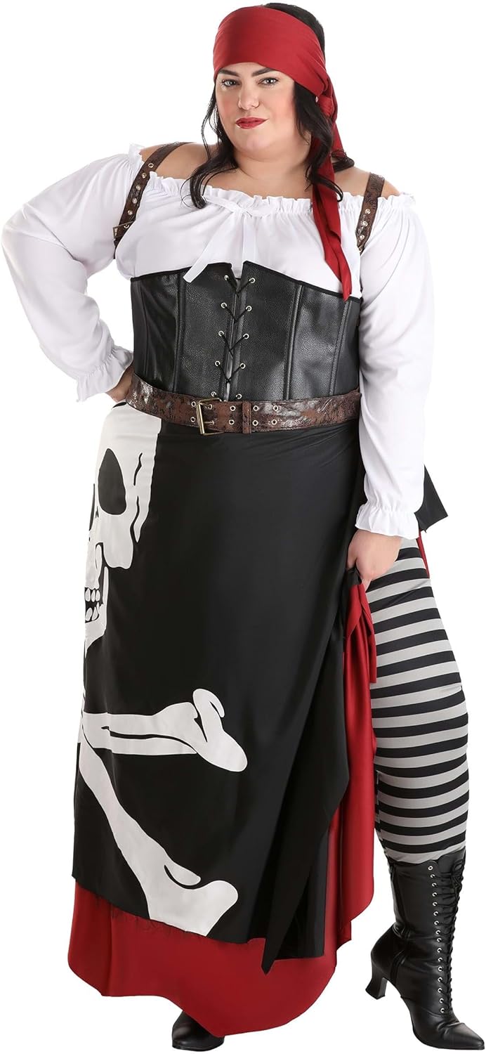 Women's Plus Size Pirate Halloween Costume | Complete Adult Pirate Outfit w/Blouse, Corset, Skirt, Leggings, & Accessories