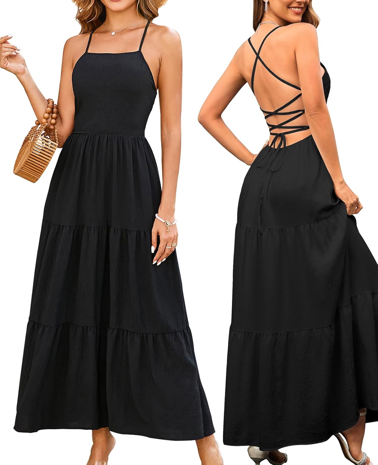 GLNEGE Women's Summer Boho Long Dresses Spaghetti Backless Lace Up Beach Dress Vacation Flowy Sundresses 2025