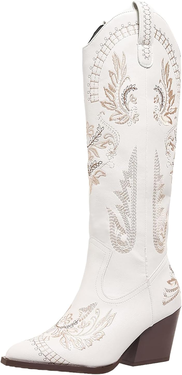 Cowboy Boots for Women Wide Calf Cowgirl Boot Embroidered Western Pointed Toe Chunky Heel Pull On Knee High Retro Tall Boot Ladies Boots