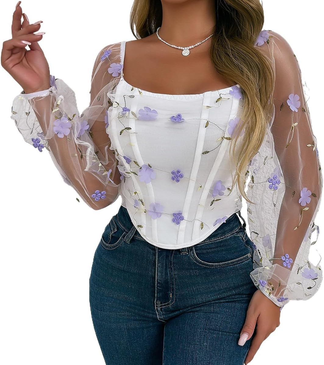 Women's Floral Embroidered Mesh Sleeve Crop Top Square Neck Slim Fit Off-Shoulder Trendy Blouse