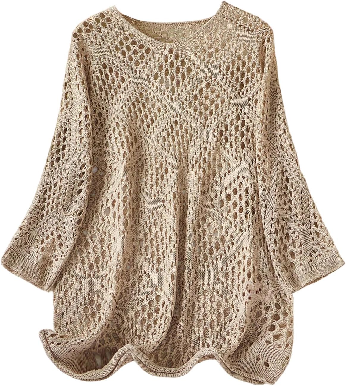 Floerns Women's Hollow Out Crochet Sweater V Neck Long Sleeve Vacation Casual Knit Tops