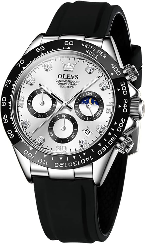OLEVS Men Analog Quartz Waterproof Watches Multifunction Chronograph Diamond Moon Phase Luminous Silicone Band Wrist Watches