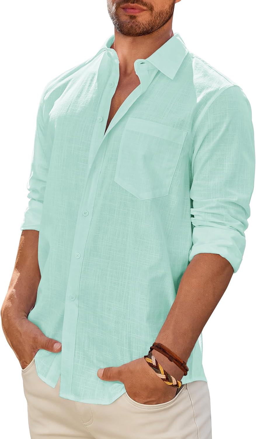 DEMEANOR Mens Linen Shirt Long Sleeve Casual Cotton Solid Regular Fit Wedding Summer Beach Button Down Shirt