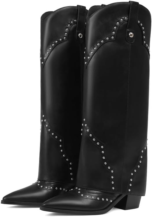 Erocalli Shark Fold Over Cowboy Cowgirl Boots Studded - Knee High, Tall, Western, Slouch, Pointed Toe, Pull on, Fashion Boot, Dress