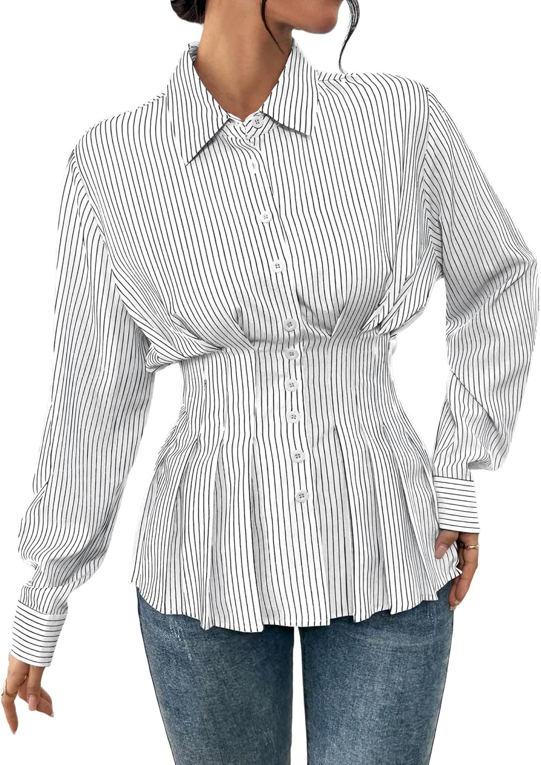 Bsubseach Women Blouses Striped Long Sleeve Button Down Shirts V Neck Collared Boho Tops 2026 Casual Business Work Outfits