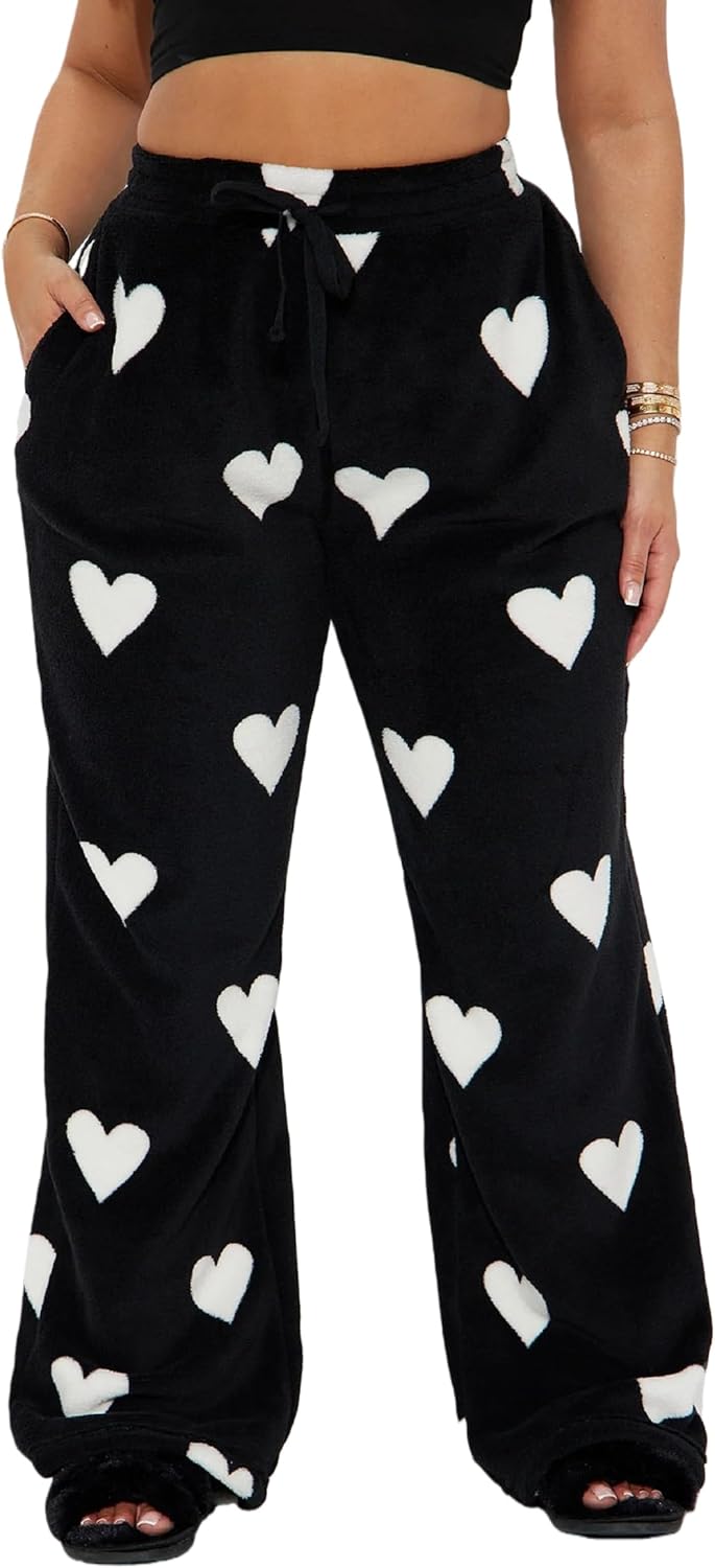 Women Heart Plush Pajama Pants Fuzzy Wide Leg Drawstring Lounge Bottoms Y2k Flannel Valentines Pj Pants