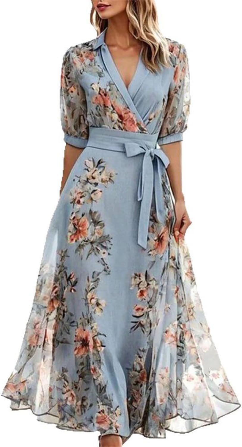 Women's Blue Chiffon Boho Floral Print V-Neck Short Sleeve Long Dress, Loose Fit Belted Waist A Line Long Dresses