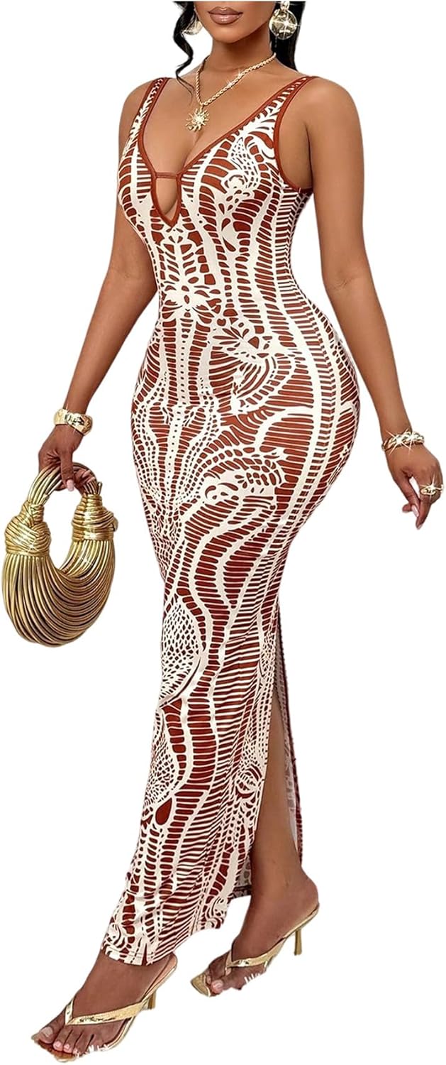 Floerns Women's Summer Long Dress Graphic V Neck Sleeveless Tank Vintage Bodycon Maxi Dresses