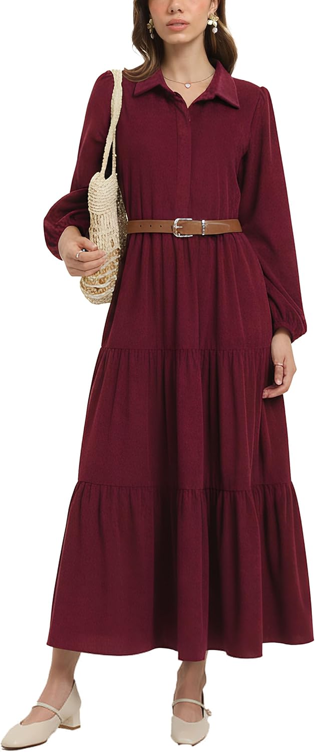 D-Sun Women Corduroy Maxi Dress Casual Long Sleeve Button Down Fall Winter Shirt Long Tiered Flowy Corduroy Dress with Pocket