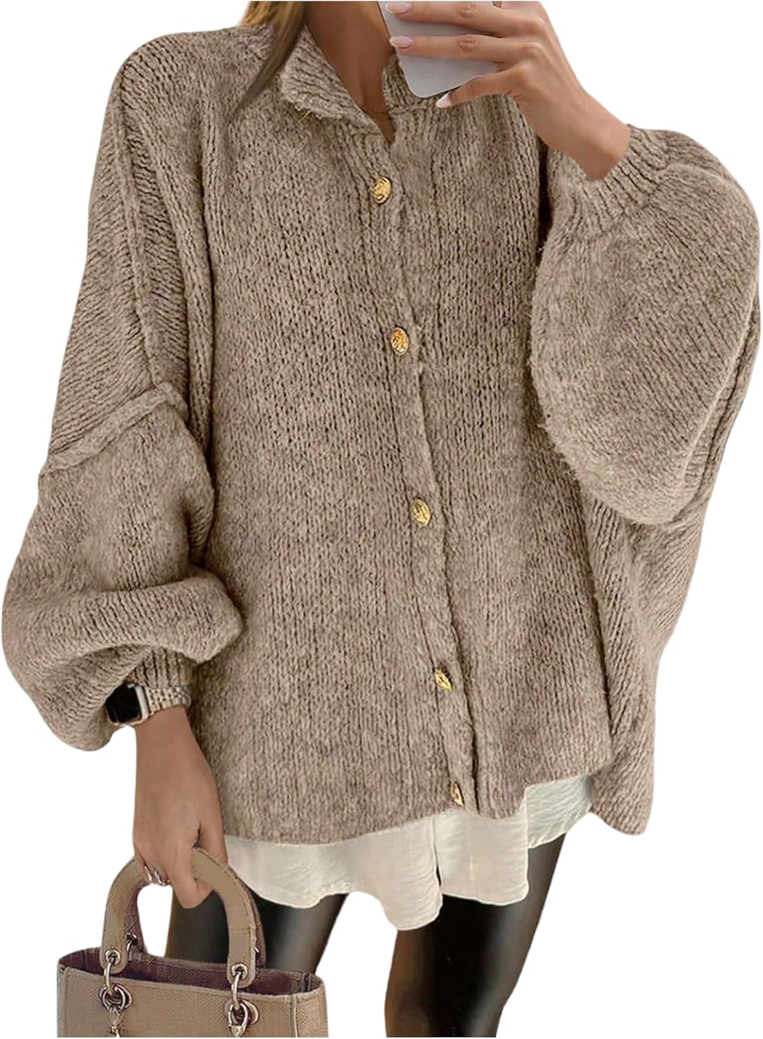 GORGLITTER Women's Button Down Chunky Knit Cardigan Holiday Cozy Sweaters Oversized Lantern Long Sleeve Jacket Trendy