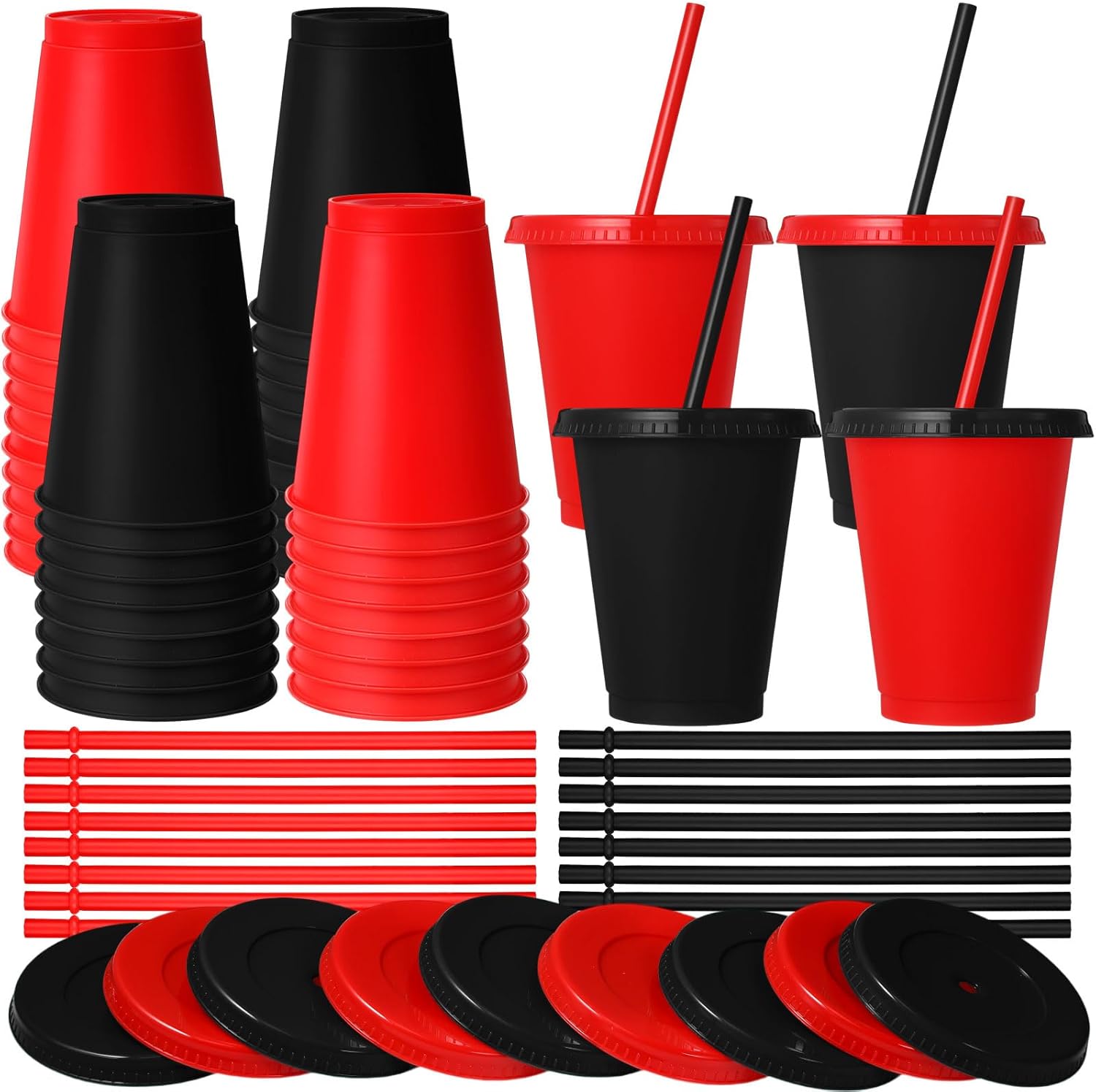 - Package List: the package contains 16 pieces of plastic cups with lids and straws in red and black colors, which measure approx. 4.7 x 4.1 x 2.4 inches/ 12 x 10.5 x 6 cm (height x rim diameter x bottom diameter), and the capacity is approx 16 oz, can hold large amounts of beverages such as wine, cocktails, champagne, juice, water, soda, whiskey, coffee, tea, beer, cola, juice, and milk, etc