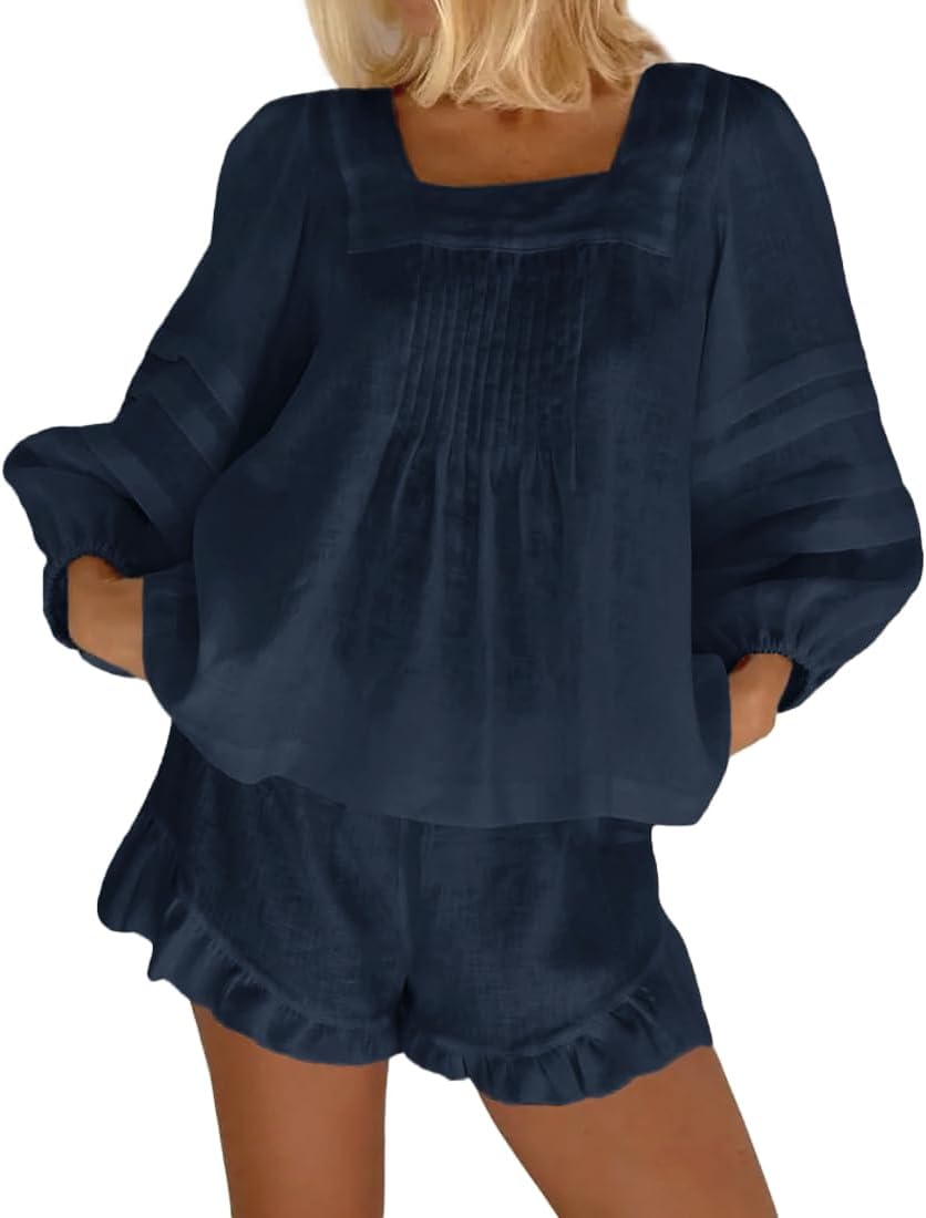 Womens 2 Piece Sets Puff Long Sleeve Square Neck Top and Ruffle Shorts Cotton Pajamas Set