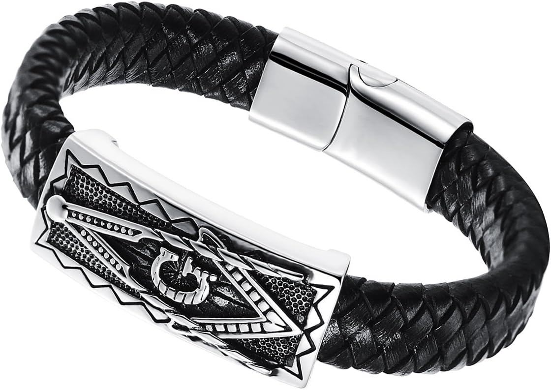 Cupimatch Mens Stainless Steel Masonic Freemason Leather Bracelet Cuff Bangle with Magnetic Clasp (Type 2) for Valentine's Day