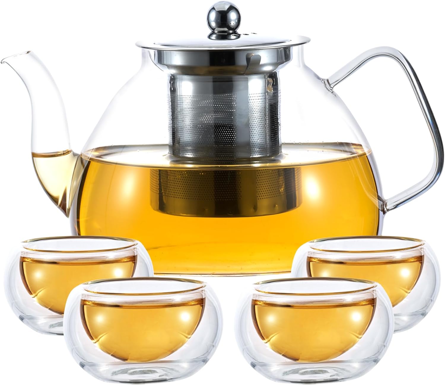 1200ml/40 oz Glass Teapot with 4 Double Wall Teacups and Removable Stainless Steel Infuser, Tea Sets for Adults, Clear Tea Kettle Stovetop Safe for Loose Leaf and Blooming Tea,Gifts for Christmas