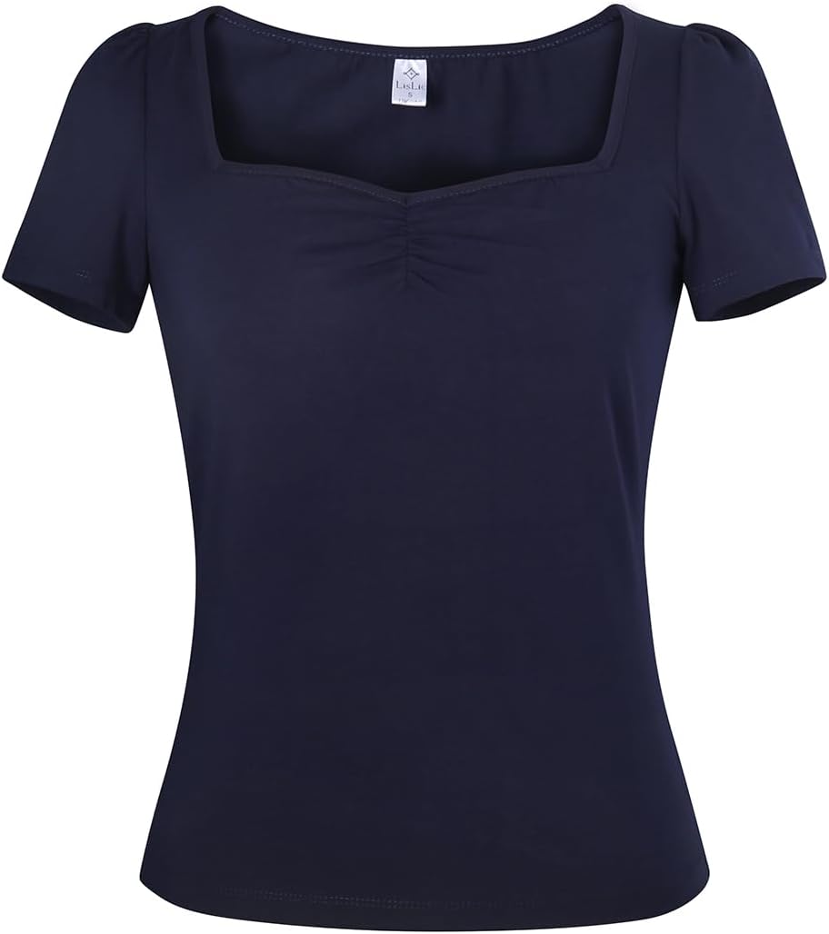 Women's 1950s Rockabilly Tops, Cute Cotton Elastic Vintage Style Knit Shirts, Dressy Casual Soft Blouse for Women