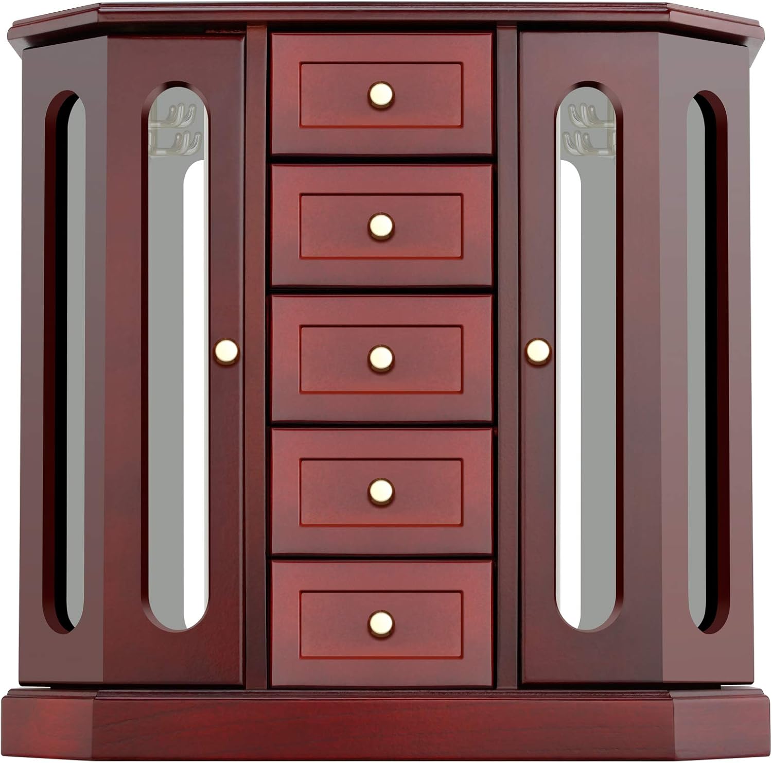 RR ROUND RICH DESIGN Jewelry Box - Made of Solid Wood with Cabinet Type 5 Drawers Organizer and 2 Separated Open Doors on 2 Sides and Large Mirror Brown
