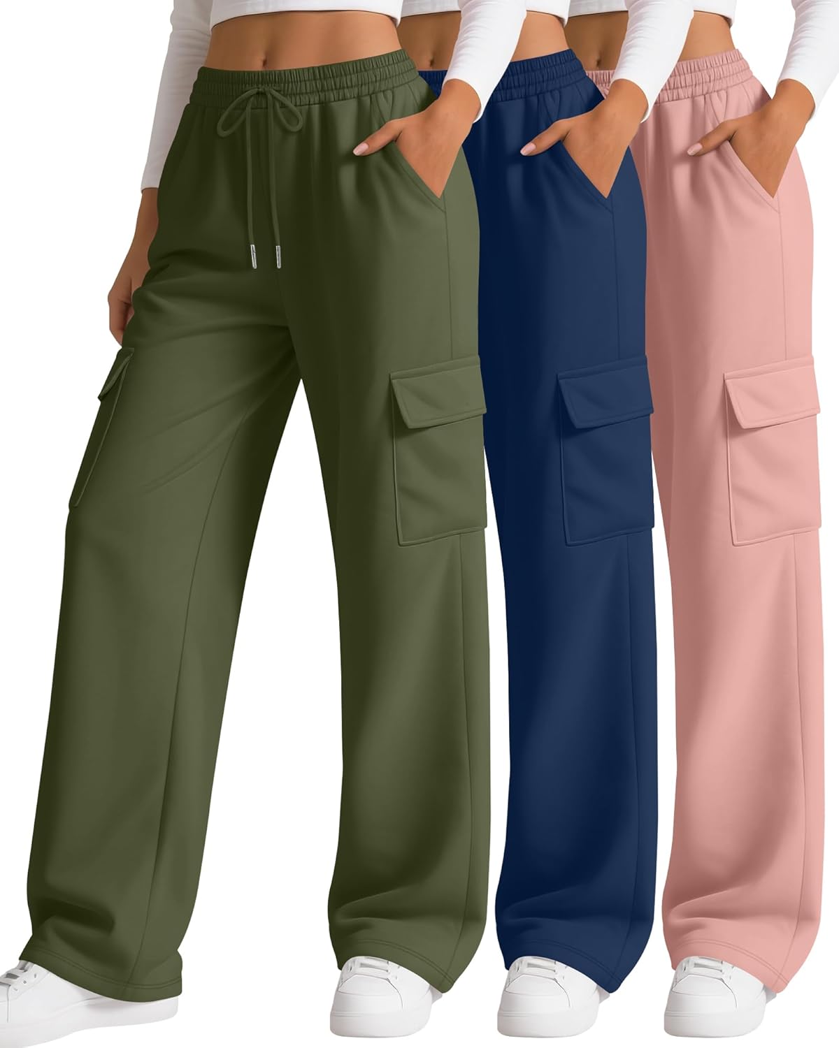 Neer 3 Pack Women's Cargo Sweatpants Wide Leg Baggy Loose Elastic Drawstring Pants Casual Athletic Joggers with 4 Pockets