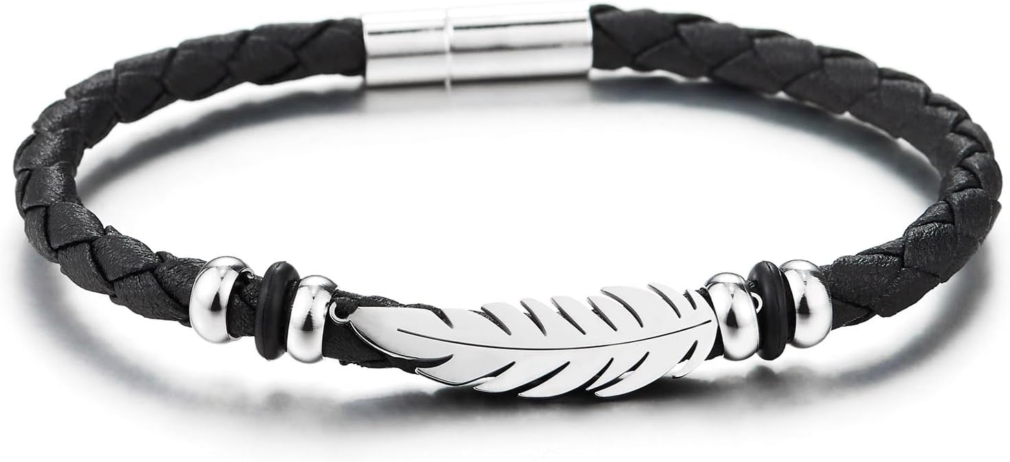 COOLSTEELANDBEYOND Braided Leather Bracelet for Men Women with Silver Color Feather Charm, Boho Tribal Style Jewelry