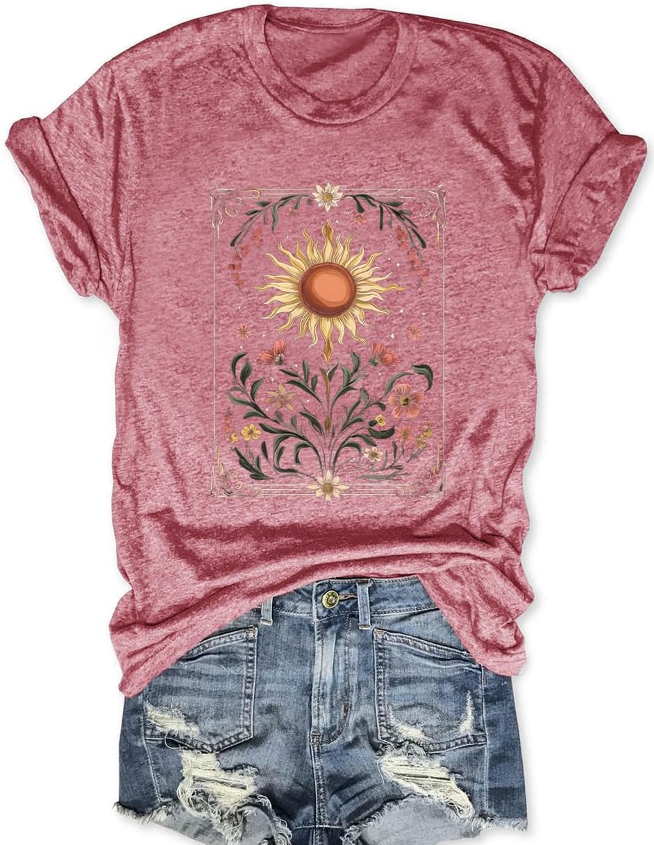 Boho Tops for Women Mystic Moon and Sun Wildflowers T-Shirt Celestial Tees Spiritual Astrology Shirt
