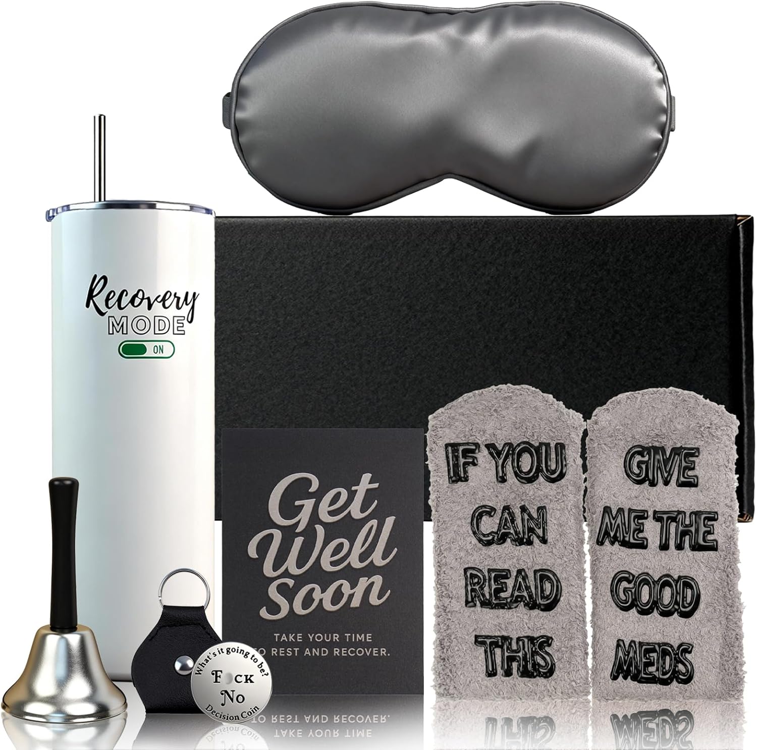 - Complete Get Well Soon Gift Set: This thoughtful package features a 20oz hospital mug, humorous recovery cotton socks,a sleep mask,a decision coin, and a durable steel hand bell, perfect for brightening the spirits of friends and family during their recovery from surgery or illness.