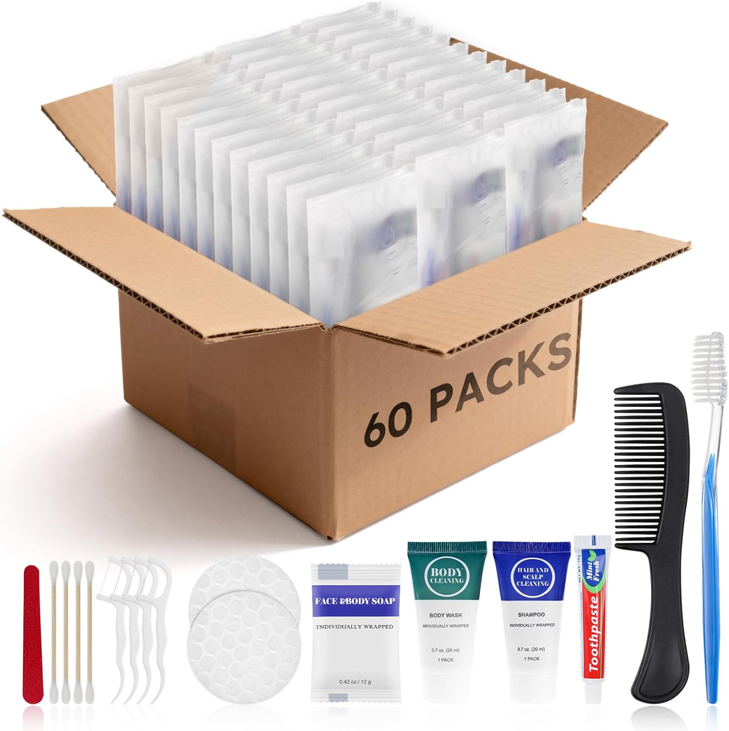 - Basic Toiletry Kits : You will receive 60 toiletries sets, each includes 1 x toothbrush with 0.34 oz / 10 g toothpaste, 1 x 0.68 oz / 20 ml body wash, 1 x 0.68 oz / 20 ml shampoo, 1 x 6" / 15 cm comb , 1x floss picks pack ( with 4 floss picks ), 1 x 0.42 oz / 12 g soap, 1 x care package ( including 4 x cotton swabs, 1 x nail file, 1 x cosmetic cotton pads ), covering on-the-go personal basic care need, everything you need is neatly packed in one convenient travel size package