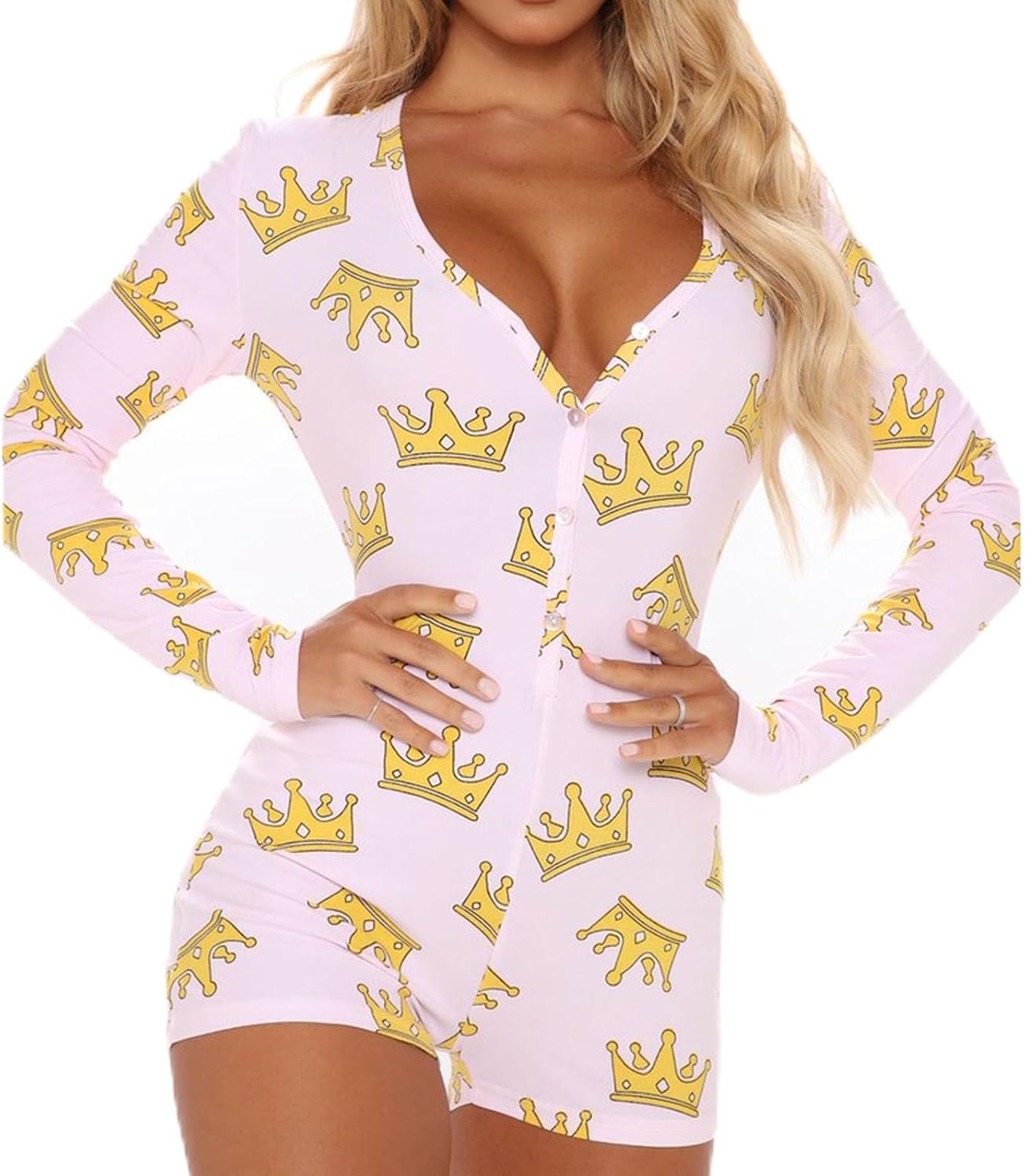 HOXIJIA Women Heart Printed Rompers Long Sleeve V Neck Button Down Short Jumpsuits Bodycon Pajamas Bodysuits for Valentine