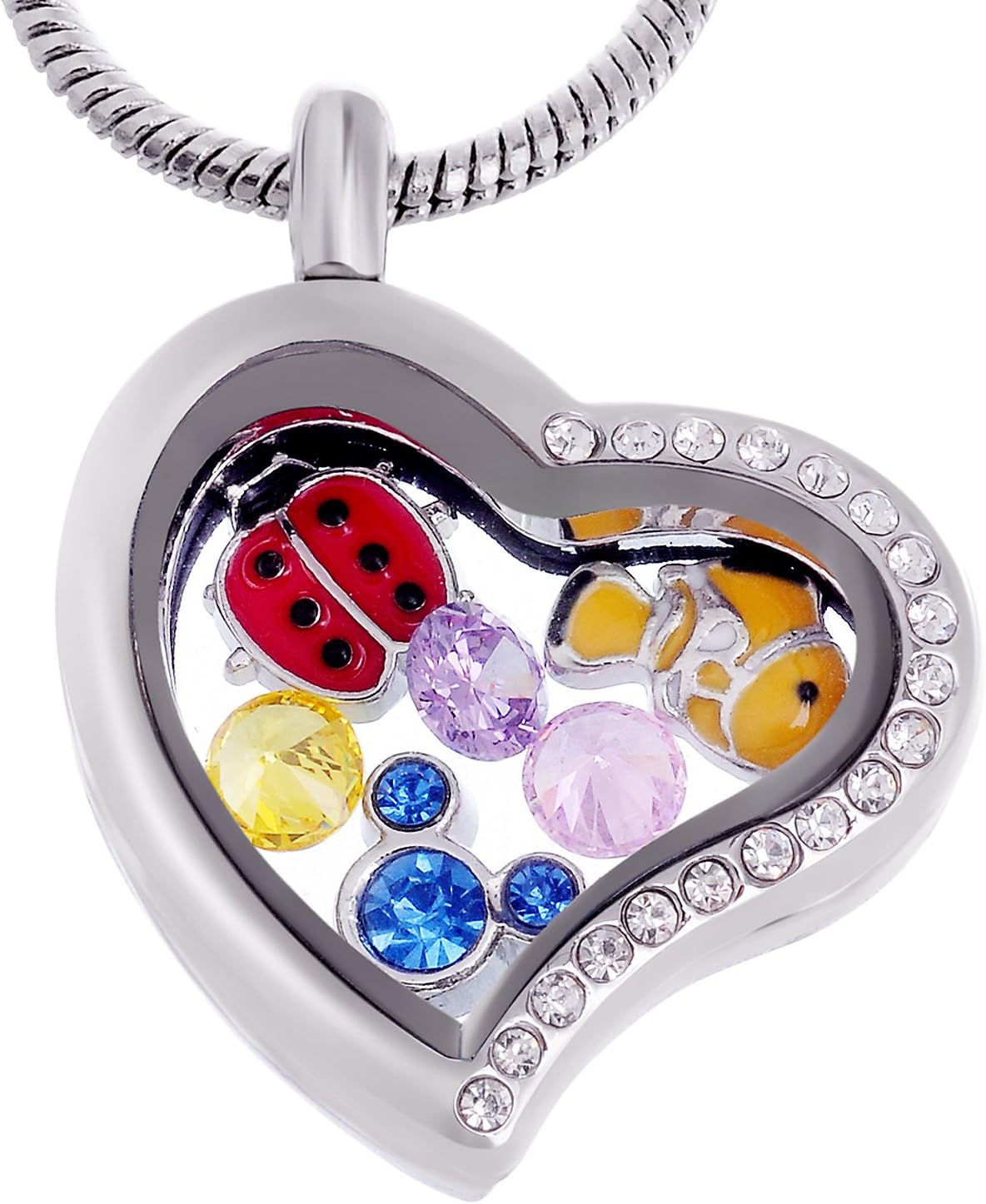 RUBYCA Themed Heart Locket Necklace Crystal Birthstone Living Memory Floating Charm Silver Tone DIY