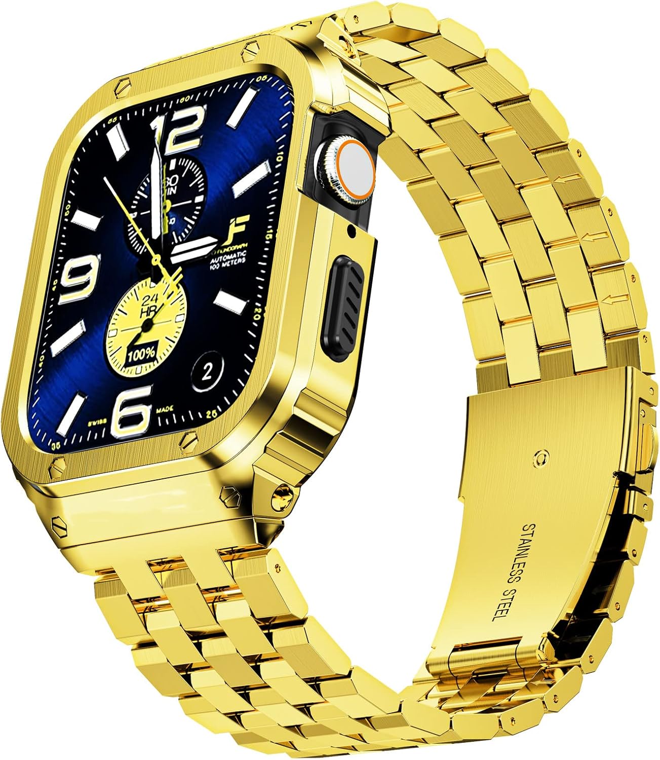 SUPLINK Stainless Steel Case with Band Compatible with Apple Watch Series 9 8 7 Bands 45mm, Metal Rugged Protective Bumper for iWatch Bands Men, Gold