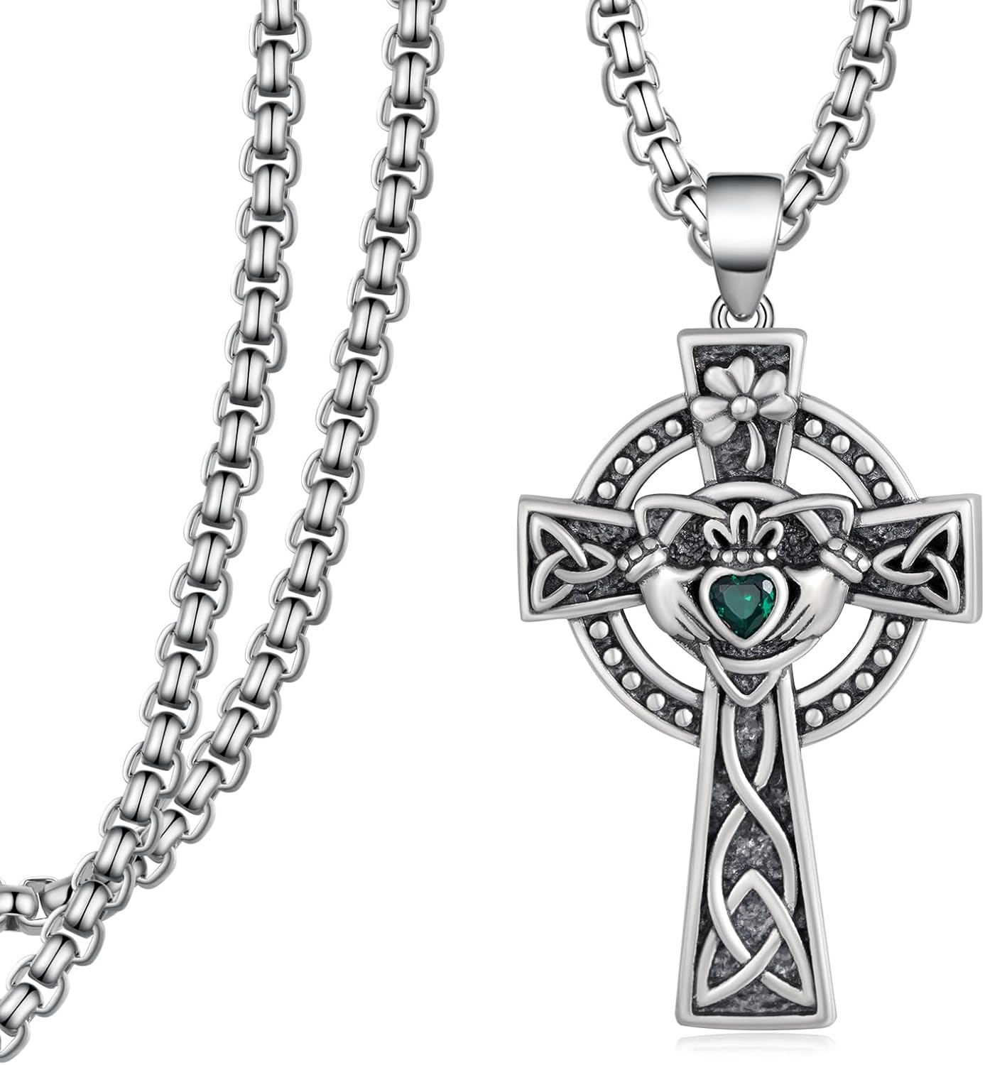 Celtic Cross Necklace for Men 925 Sterling Silver Irish Clover Necklace Claddagh Necklaces for Women Religious Amulet Gifts