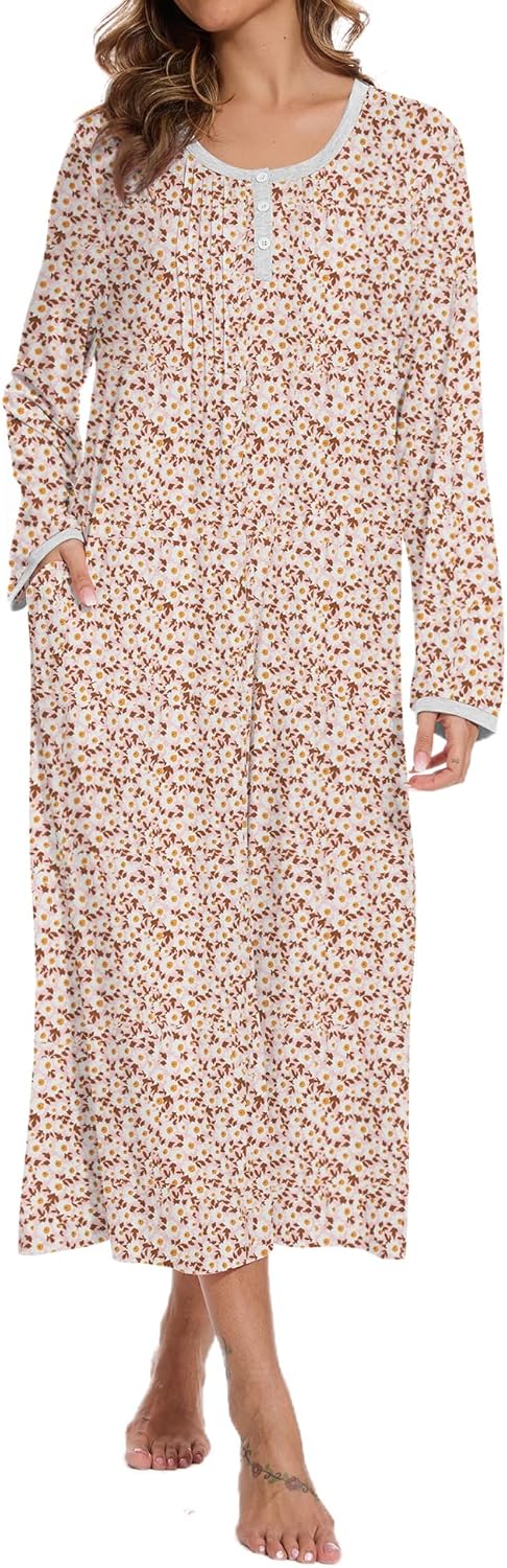 AVIIER Cotton Nightgowns for Women Soft Long Sleeve Night Gown with Pockets