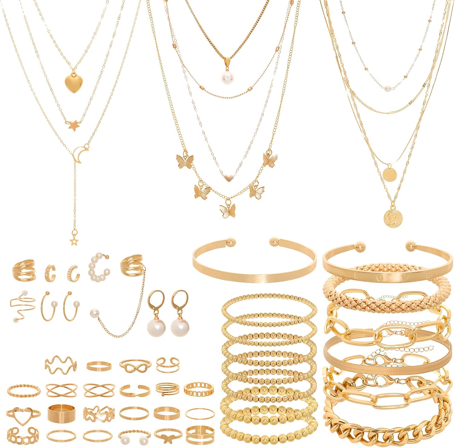 54 Pcs Gold Jewelry Set for Women Multi Layered Necklace Knuckle Rings Stackable Bracelets Dainty Ear Clips Fashion Jewelry set Anniversary Birthday Valentine Gifts for Women Girls