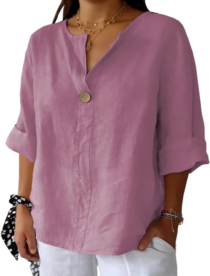 Zeagoo Button Down Shirts for Women 3/4 Sleeve Linen Cotton V Neck Tops Dressy Casual Loose Work Blouses