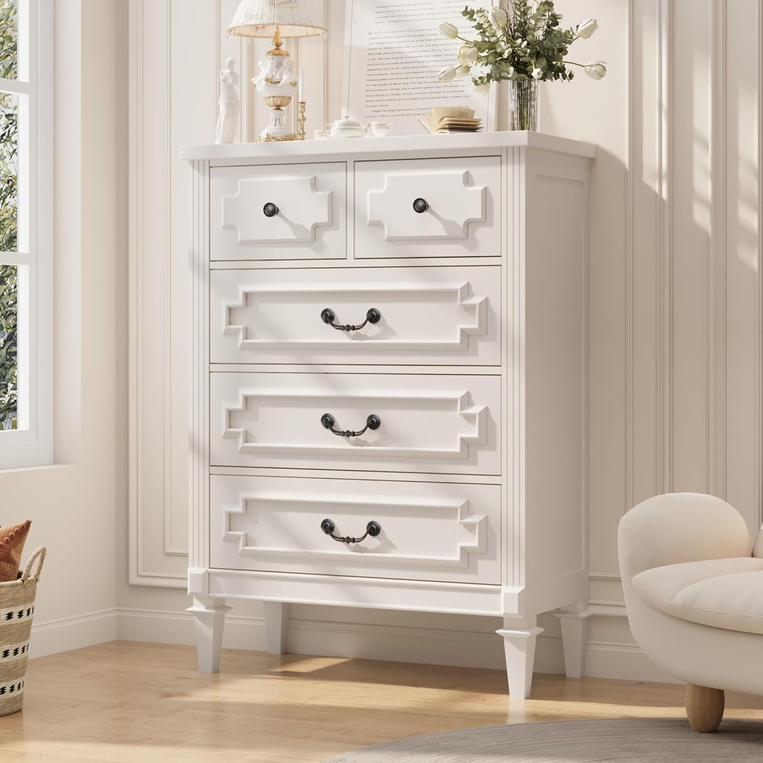 BLANKSPACE 5 Drawer Dresser for Bedroom, 44" Tall Dresser & Chest of Drawers wtih Vintage Surface, Closet Storage Cabinet for Living Room, Hallway, White