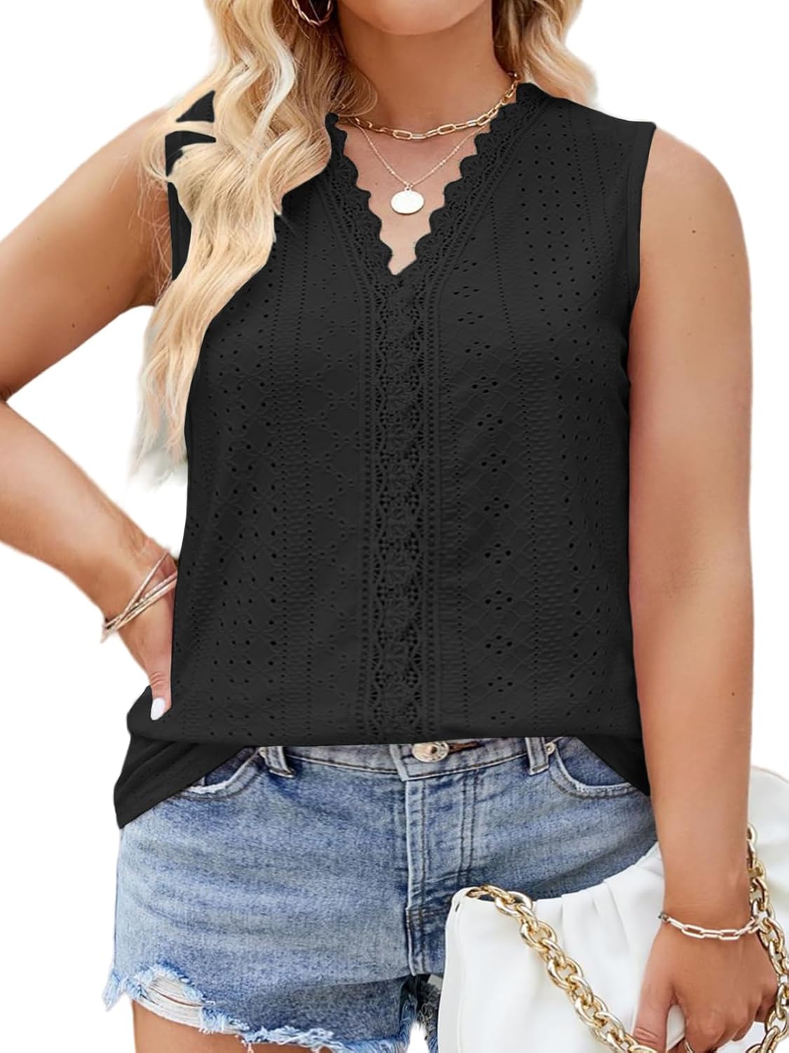 VISLILY Womens-Plus-Size-Summer-Tank-Tops Cute Lace V Neck T Shirts Casual Sleeveless Blouses Trendy Eyelet Tunics Tee