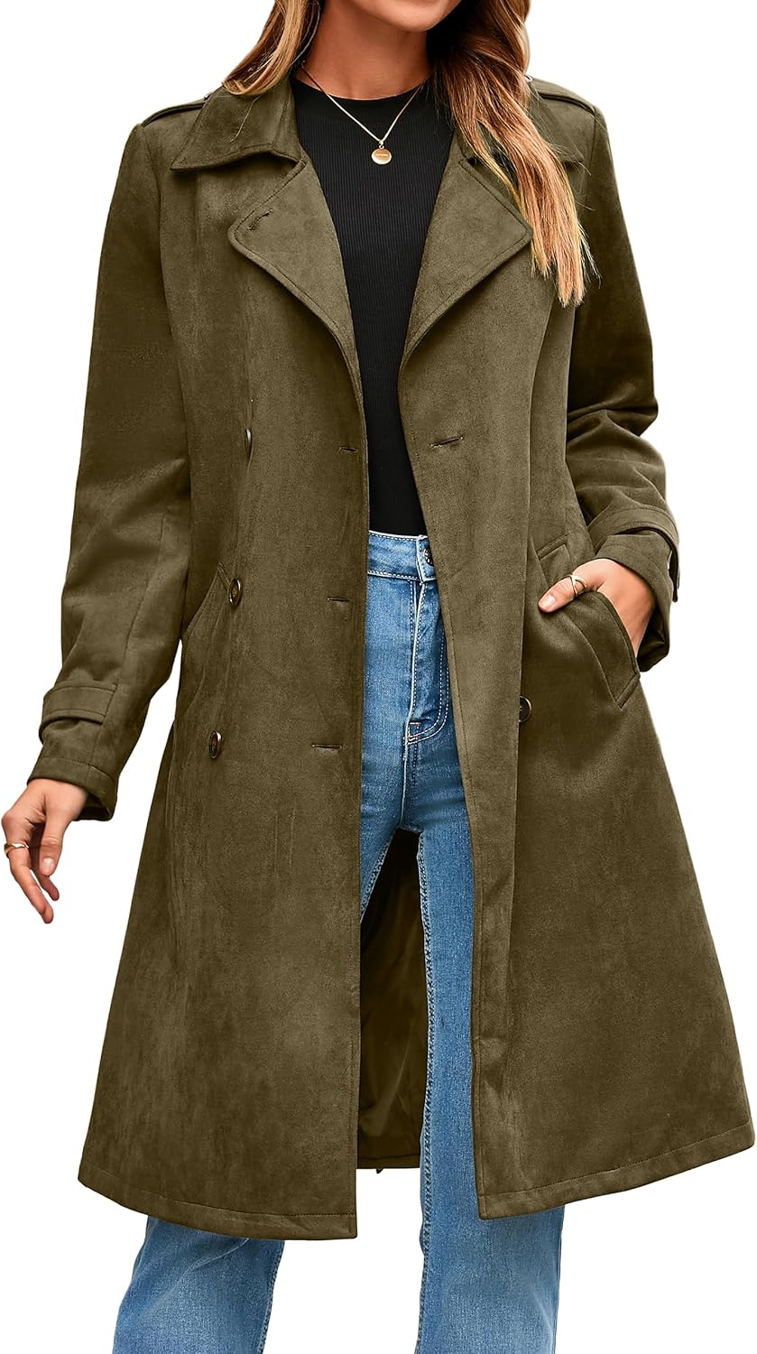 Simplee Womens Long Trench Coat Fall Winter Double Breasted Classic Lapel Slim Work Office Suede Overcoat with Belt