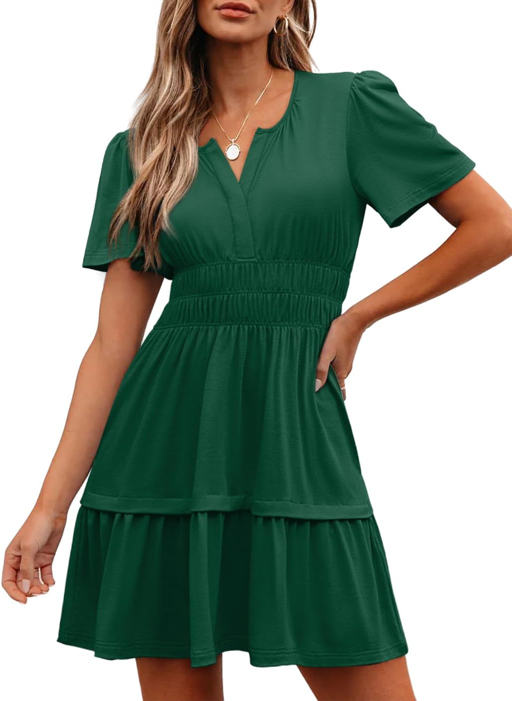 Womens Summer Mini Dress Casual Short Sleeve V Neck Smocked Waist Sundress Flowy Tiered Short Beach Vacation Dresses