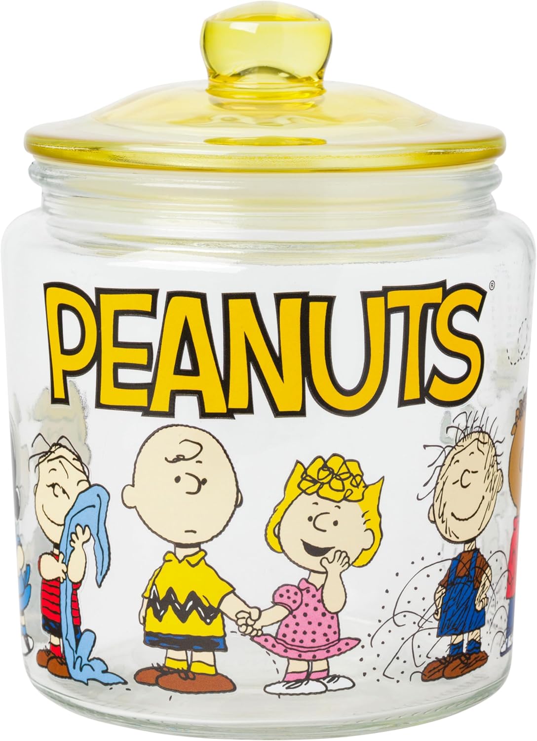 - PEANUTS GLASS JAR: Glass jar features Charlie Brown, Snoopy, Schroeder, Lucy, Linus, Sally, Pigpen, Woodstock, and Franklin cheerfully lined up. Featured above the characters is the Peanuts logo. Jar is complete with a yellow lid.
