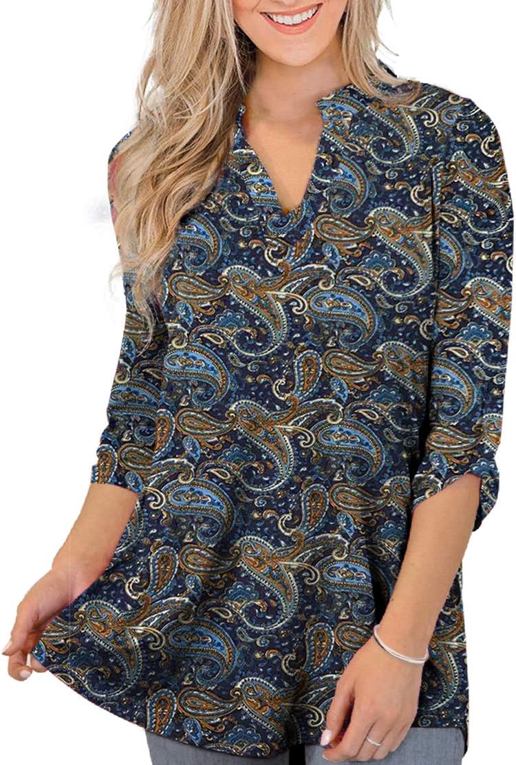 Othyroce Womens Floral Printed Tunic Tops 3/4 Roll Sleeve V Neck Blouses Long Sleeve Shirts for Women