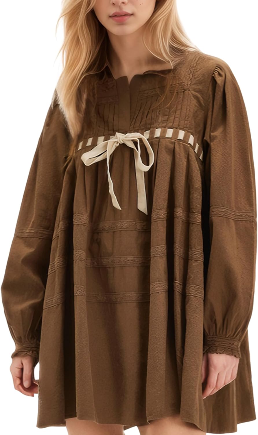 D-Sun Women Babydoll Dress Long Puff Sleeve Square Neck Lace A-Line Flowy Mini Dress Tie Embroidered Ruffled Y2K